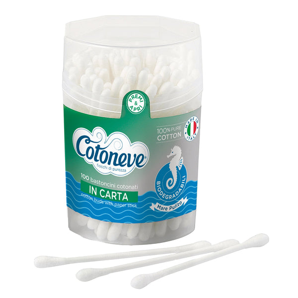 COTONEVE - Barattolo da 100 bastoncini cotonati biodegradabili - 1601B - Confezione risparmio da 5 PZ
