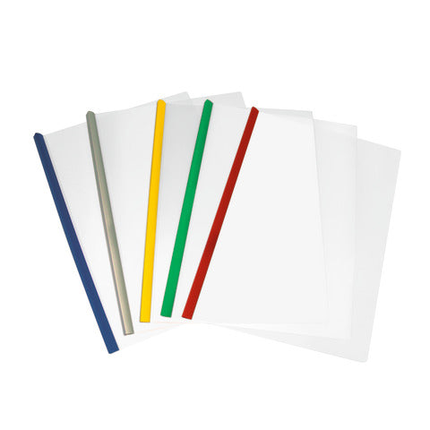 Set rilegatura composto da 5 copertine fronte e retro in PVC trasparente formato A4 e 5 dorsini legafogli colorati.