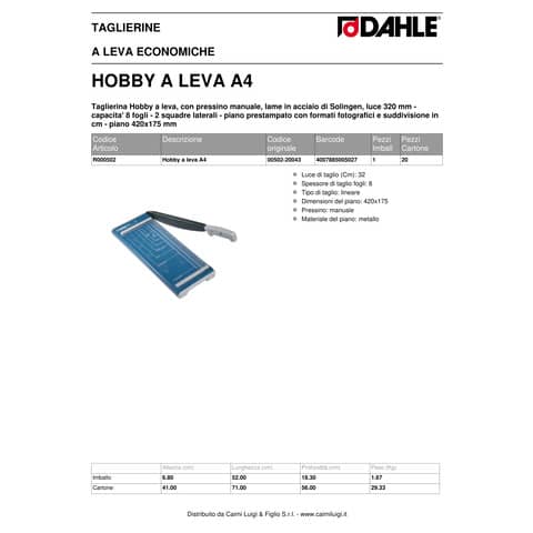 Lama in lamiera d'acciaio lavorata a stampo. Lama inferiore in acciaio. Dotata di pressino manuale proteggidita, 2 squadre laterali centimetrate, piano marcato con formati e fotografici e suddivisone in cm. Luce di taglio: 320mm. Spessore di taglio: 0,8mm. Piano: 420x175mm