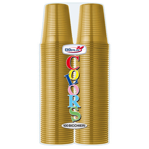 Bicchieri realizzati in polistirene R marcato. Capacità: 200 ml. Colore oro. Diametro superiore: 70 mm. Diametro inferiore: 47 mm. Altezza: 81 mm. Adatti al contatto con alimenti: fino a una temperatura massima di 90 °C per 15 minuti. Non utilizzabili in forno. Ideali per qualsiasi festa oppure evento a tema. Confezione così composta: 2 colonne da 50 bicchieri ciascuna, per un totale di 100 pezzi.