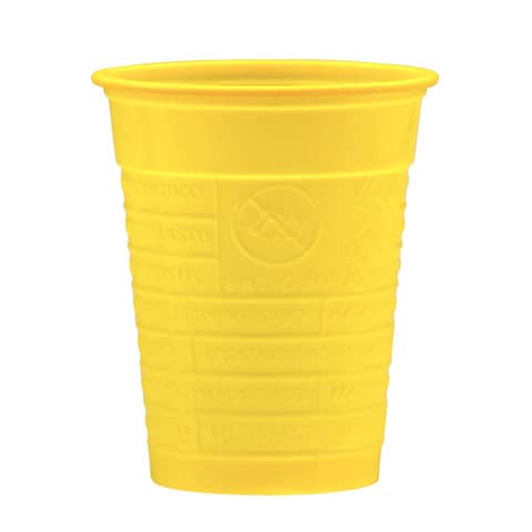 Bicchieri 200 ml R marcati gialli in polistirene. Confezione da 100 pezzi. Diametro superiore: 70 mm. Diametro inferiore: 47 mm. Altezza: 81 mm. Adatto al contatto con alimenti a Max 90°C per 15 minuti. No forni.