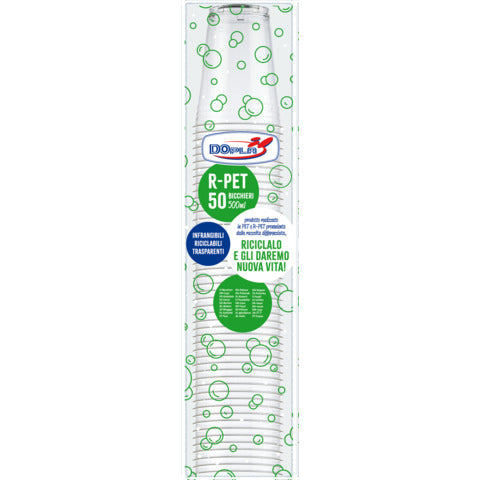 Bicchieri realizzati in R-PET trasparenti 500 ml (con tacca a 400 ml). Diametro superiore: 95 mm. Diamentro inferiore: 58,4 mm. Altezza: 120,8 mm. Adatti al contatto con alimenti fino a una temperatura massima di 50 °C per 1 ora. Prodotto conforme alle seguenti norme: Regolamento 1935/2004/CE, Regolamento 10/2011/UE e successivi aggiornamenti e modifiche, Regolamento 2023/2006/CE e successivi aggiornamenti e modifiche ed alla seguente legislazione italiana: Decreto Ministeriale 21/03/1973 e successivi aggiornamenti e modifiche, DPR 777/82 e successivi aggiornamenti e modifiche. Confezione composta da 50 pezzi.