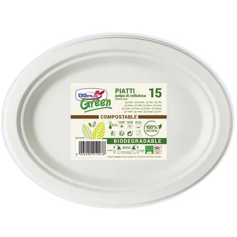 Piatti ovali realizzati in polpa di cellulosa di colore bianco. Dimensioni: 190 x 254 mm. Altezza: 26 mm. Adatti al contatto con alimenti: fino a una temperatura massima di 90 °C per 15 minuti, in forno fino a una temperatura massima di 100 °C per 30 minuti e in microonde fino a un massimo di 800 Watt per 2 minuti. È possibile utilizzarli per congelare alimenti in freezer. Biodegradabili e compostabili. Confezione composta da 15 pezzi.