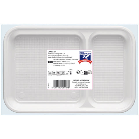 Vassoio rettangolare realizzato in polistirene a 2 scomparti. Dimensioni: 270 x 180 mm. Colore: bianco. Adatto al contatto con alimenti fino a una temperatura massima di 90 °C per 15 minuti. Non utilizzabili in forno. Confezione composta da 50 pezzi.