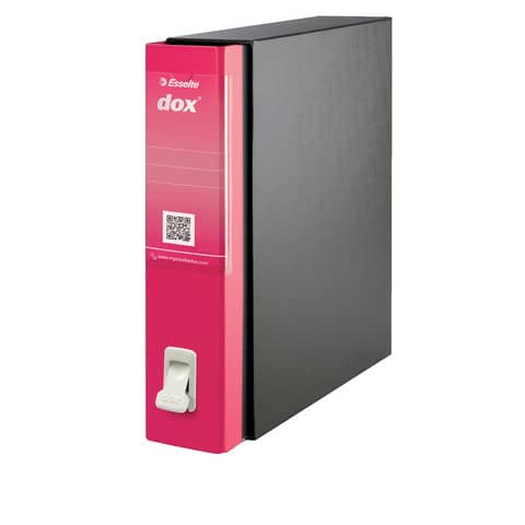 Il registratore a leva Dox 2 è rivestito con carta goffrata antimpronta e rifinito con paralati metallici alla base della plancia. E` dotato di un meccanismo a leva in acciaio nichelato con pressino, linguella di estrazione a scomparsa e portaetichette con etichetta reversibile. La custodia è rivestita con carta nera goffrata trattata antimpronta con interno nero. Ogni dox possiede al suo interno un volantino con il codice QR da applicare sull' etichetta e 3 semplici indicazioni per come scaricare la app su App Store e Google play Dorso: 8 cm. Modello: Protocollo. Colore: fucsia.