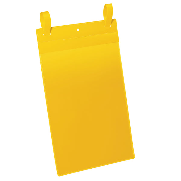 Tasche per identificazione con fascette di aggancio. Applicazione facile e sicura su grigliati metallici e contenitori per stoccaggio e trasporto. Robuste e resistenti all'usura e agli strappi, sono realizzate con retro in plastica colore giallo e copertina frontale trasparente. Possono essere utilizzate anche in aree esterne in quanto dotate di aletta di chiusura che protegge i documenti dagli agenti atmosferici, sporco e umidita'. Adatte all'uso con scanner. Facile sostituzione dell'inserto. F