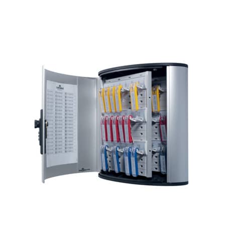 Cassetta portachiavi in alluminio capacità 36 chiavi, dotata di serratura a combinazione a tre cifre, facile da impostare. Il design moderno e sobrio è studiato per renderla adatta a qualsiasi ambiente, elegante anche esposta a vista. I particolari pannelli interni a cremagliera permettono alle barre portachiavi di essere agganciate all'altezza desiderata, assicurando un'alta versatilità di gestione. L'esclusivo portachiavi a scatto mostra solamente l'etichetta sempre in posizione frontale e nasconde completamente la chiave stessa, questo assicura l'identificazione immediata delle chiavi e una visione sempre ordinata del contenuto della cassetta. Lo sportello si apre a più di 90° per facilitarne l'accesso. Dal sito www.durable.it è possibile scaricare template gratuiti per la personalizzazione degli inserti. Include 6 portachiavi KEY CLIP in colori assortiti e minuteria. Dimensioni: 302 x 118 x 280 mm (LxPxH)72 Chiavi