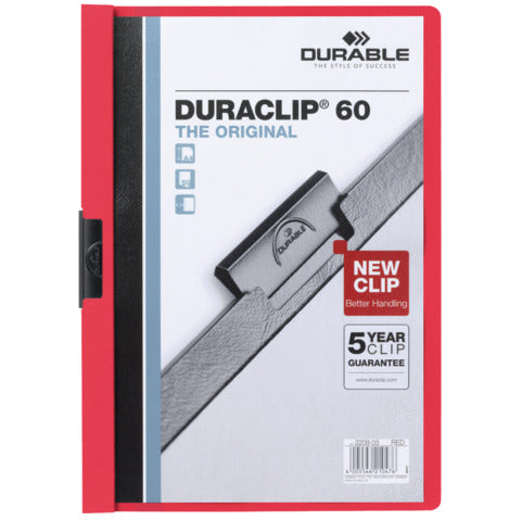 L'originale cartellina con clip inventata e brevettata da DURABLE nel 1959 e prodotta in Germania. Cartellina realizzata in PVC di alta qualità con clip in acciaio, copertina trasparente e retro colorato. La clip si adatta al numero di fogli inseriti e il suo perfetto funzionamento è garantito 5 anni. Ideale per presentare e archiviare, in modo professionale, documenti non perforati: tira la clip - inserisci i documenti - riposiziona la clip - semplice! Con DURACLIP® i tuoi fascicoli avranno sempre un aspetto professionale, ordinato e organizzato. Capacità 1-60 fogli formato A4.