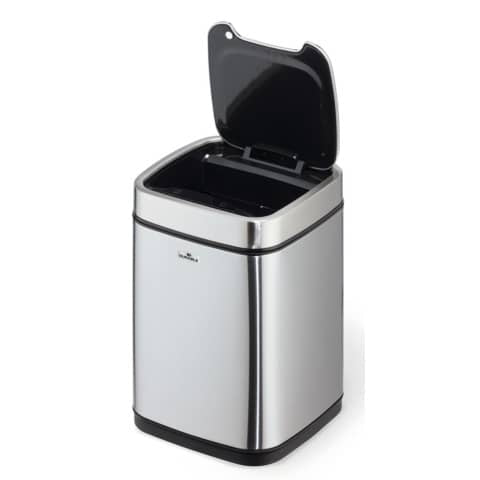 Cestino per rifiuti con capacità 6 litri e funzionamento contactless, che permette di smaltire i rifiuti senza entrare in contatto con il contenitore. Il sensore di movimento fa aprire il coperchio, che si richiude automaticamente; nel caso in cui il sensore non rilevasse il movimento è possibile aprire e chiudere il coperchio manualmente tramite i tasti Open/Close. Il coperchio ha una chiusura rallentata e silenziosa. Dotato di contenitore interno estraibile con maniglia, ideale per un facile smaltimento dei rifiuti, e anello ferma sacco di rientranza sul retro per il trasporto. Realizzato in acciaio inossidabile con rivestimento che previene ditate o impronte. La base è antiscivolo e con forma quadrata salvaspazio. Alimentato da 4 batterie AAA (non incluse). Dimensioni: 21 x 31,5 x 21 cm (L x H x P).
