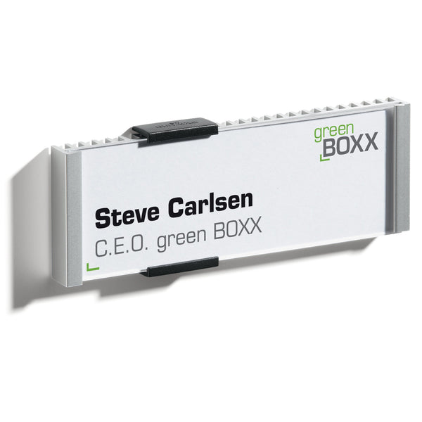 Targhe per porte e pareti professionali, dal design classico, funzionale e raffi nato, ideali per ogni applicazione. Pannello frontale in acrilico trasparente antirifl esso e retro in alluminio di alta qualita'. Doppio sistema di fi ssaggio a vite o con bi-adesivo, ideale in ambienti dove non si desidera praticare fori. Il cartoncino inserto, certifi cato pefc, puo' essere personalizzato e stampato on-line tramite il software gratuito duraprint®
