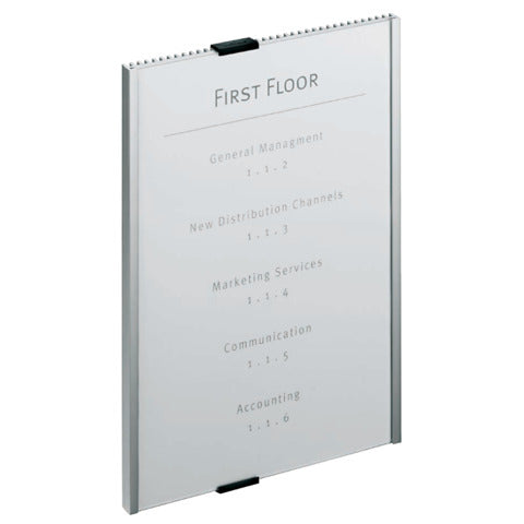 Targa per porte e pareti dal design classico, funzionale e raffinato, ideale per uffici e sale riunioni. Dotata di retro in alluminio di alta qualità e pannello frontale scorrevole in acrilico trasparente antiriflesso. I due cappucci neri fissati alle estremità consentono una facile apertura del pannello frontale. Si applica su qualsiasi superficie grazie al kit di montaggio a vite o al bi-adesivo inclusi nella confezione. Soluzione vincente anche in ambienti dove non si desidera praticare fori. L'inserto in cartoncino incluso può essere personalizzato e stampato on-line tramite il software gratuito DURAPRINT® sul sito www.duraprint.itFormato: 210 x 297 mm (A4 verticale).