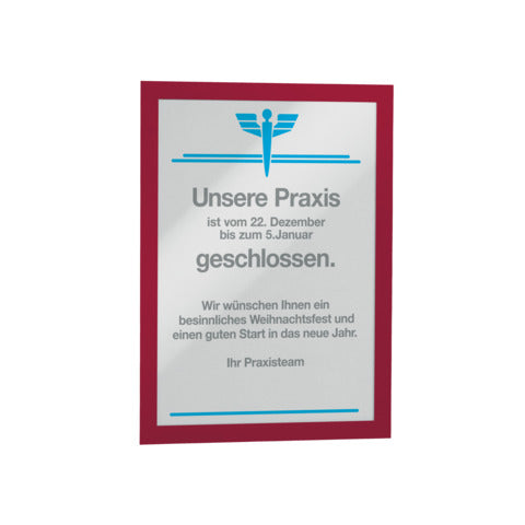 Cambia abitudine, esponi con stile!DURAFRAME® è la cornice espositiva adesiva ideale per esporre avvisi e materiale informativo su superfici lisce e solide.Presentazione ordinata e professionale di avvisi e materiale informativo. L'inserto è facilmente sostituibile semplicemente sollevando il pannello magnetico. Aderisce perfettamente su superfici lisce e solide ed è rimovibile dalle superfici come il vetro. Per esporre documenti f.to A4. Su superfici vetrate permette la visualizzazione delle informazioni da entrambi i lati. Cornice identica da entrambi i lati. Utilizzabile sia in posizione verticale sia in orizzontale. Dimensioni esterne: 236 x 323 mm.
