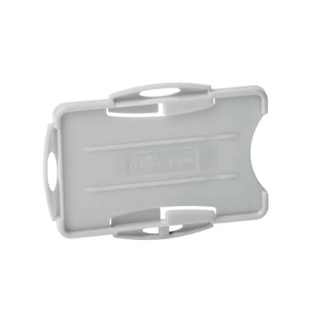Portabadge per 2 tessere realizzato con almeno l'80% di plastica riciclata. Prodotto ecosostenibile certificato Blue Angel. Il fronte aperto è adatto per agevolare la lettura del chip, per il rilevamento delle presenze a radiofrequenza (RFID) o per la timbratura tramite terminali a prossimità. Utilizzabile sia in formato orizzontale che verticale, con catenelle, cordoncini in tessuto, clip o chiocciole yo-yo. Formato inserto: 54 x 87 mm (H x L)