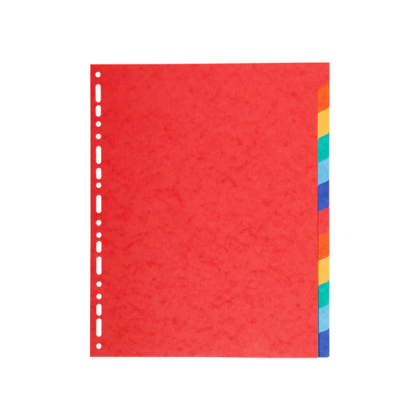 Divisori in cartoncino riciclato (certificazione blue angel da 220 gr. Dotati di 12 tasti neutri colorati (colori assortiti. Perforazione universale. Formato esterno: 24,2x29,7 cm.