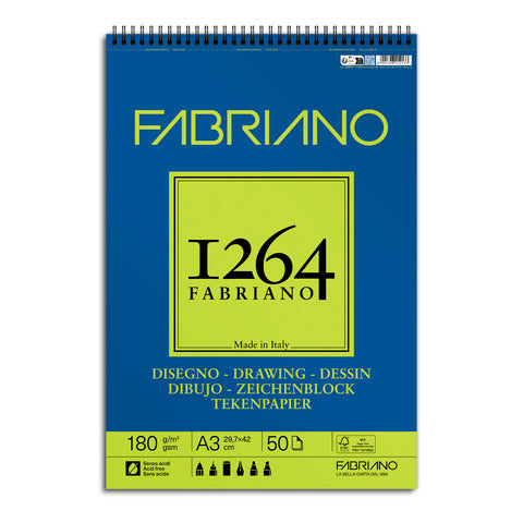 Blocco da disegno spiralato Fabriano 1264, la carta presenta una superficie bianca leggermente ruvida. Vellutata al tatto, consente la realizzazione di disegni accurati fin nei minimi dettagli. I fogli sono microperforati con formato reale dopo lo strappo. Carta certificata FSC, Acid Free e prodotta con energia idroelettrica. Carta da 180 grammi, blocco composto da 50 fogli. Formato A3.