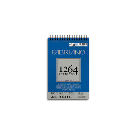 Blocco da disegno spiralato Fabriano 1264, la carta da disegno nera presenta una superficie ruvida che trattiene i pigmenti. Permette di realizzare dei brillanti disegni in bianco e nero e rinforza i contrasti dei disegni colorati. I fogli sono microperforati con formato reale dopo lo strappo. Carta certificata FSC, Acid Free. Carta da 200 grammi, blocco composto da 40 fogli. Formato A5.