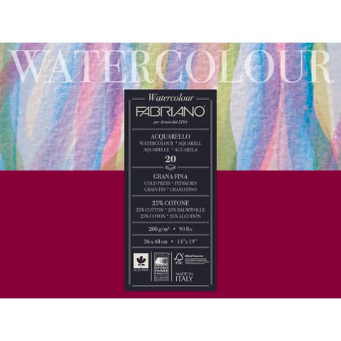 Blocco acquarello WaterColour, collato su 4 lati in grana fine. La carta per acquarello Fabriano Watercolour è realizzata con una pregiata miscela di cotone e cellulosa priva di lignina. Prodotta con il 25% di cotone e cellulosa ECF ( Elemental Chlorine Free ), certificata FSC proveniente da foreste gestite da rigorosi standard ambientali, sociali ed economici. L'assenza di acidi garantisce l'inalterabilità nel tempo della carta. Collata in massa e in siperficie assicurando un assorbimento ottimale. Adatta per gli studenti delle scuole di belle arti e per chi si avvicina alle tecniche pittoriche. Ideale per acquarello, tempera, gouache, acrilico, inchiostro e disegno. Formato 36x48 cm, 20 fogli da 200 g.
