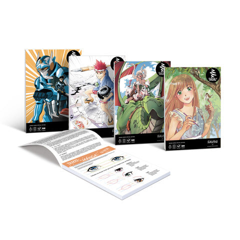 Album Favini Schizza e Strappa edizione speciale Manga realizzata e sviluppata in collaborazione con l'accademia Europea di Manga. All'interno di ogni blocco c'è una scheda con le indicazioni e le guide per realizzare i vostri primi disegni manga, da staccare e utilizzare come guida per esercitarsi nel disegnare i volti, i corpi, gli occhi e il movimento. Blocco in leggerissima carta naturale, particolarmente adatto a grafici, stilisti e creatori di moda. Composto da 100 fogli da 55 grammi. Confezione da 4 blocchi.
