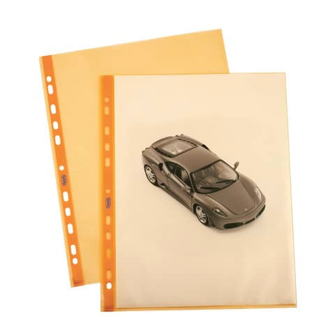 Busta forata in arancio realizzata in polipropilene trasparente liscio, con foratura universale. Altissimo spessore e massima protezione dei documenti. Formato 22x30cm. Made in italy