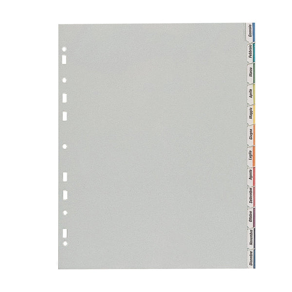Divisori realizzati in polipropilene di colore grigio da 120micron. Dotati di 12 tacche neutre e di un cartoncino stampato e fustellato per la personalizzazione delle tacche. Foratura universale. Formato esterno: 24,2x30,5 cm. Formato interno: 22x30 cm. Made in germany