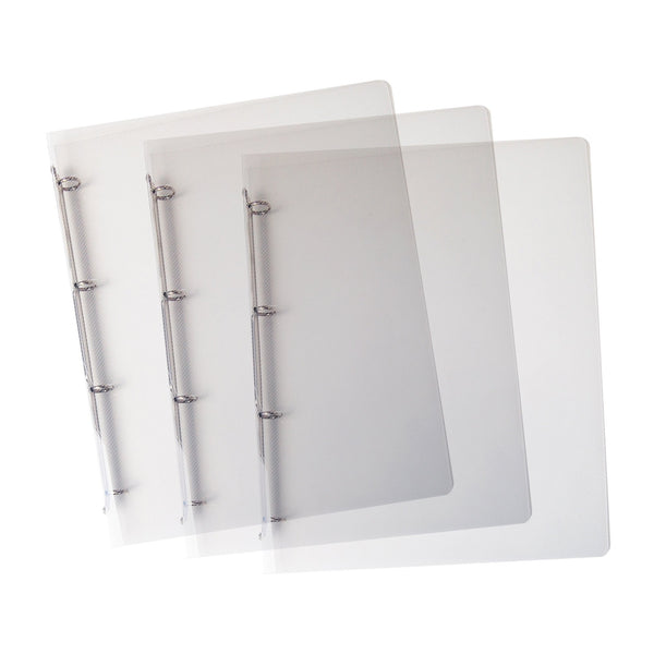 Realizzati in polipropilene colorato con speciale finitura rigata. Disponibili in 5 colori: arancio, fucsia, verde, azzurro e neutro. Formato interno 22x30cm. Dotati di meccanismo a 4 anelli tondi con d15mm e d30 mm. Made in italy.