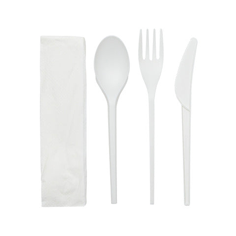 Kit di posate TRIS. Forchetta in CPLA Lunghezza : 171 mm. Peso: 3,7 grammi. Coltello in CPLA Lunghezza: 165 mm. Peso: 3,8 grammi. Cucchiaio in CPLA Lunghezza: 165 mm. Peso: 4,5 grammi. Tovagliolo 1 velo Dimensioni: 33 x 33 cm. Kit in busta biodegradabile e compostabile in PLA. Temperatura di esercizio: da -18 °C a +80 °C. Utilizzabile in freezer a basse temperature. Certificazioni: TUV INDUSTRIAL - DIN CERTCO. Colore: bianco. Prodotto PFAS Free. Confezione composta da 800 pezzi.