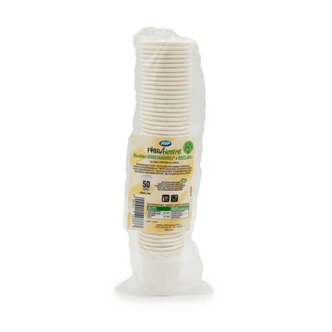 Bicchiere bianco Fibraware 2,5 g in cartoncino PAP con capacità 120 ml (80 cc) e diamentro 62 mm. Confezione da 50 pezzi. Idoneo a venire a contatto con alimenti a base acquosa, acida e grassa a temperatura ambiente o inferiore per periodi di tempo prolungati e alla temperatura massima di 70°C per tempi inferiori a 2h e alla temperatura massima di 90°C per tempi inferiori a 1h.