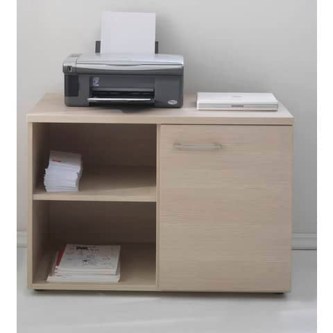 Piano in nobilitato melaminico di spessore 25 mm, fianchi, retro e anta spessore 18 mm. Mobile diviso in due sezioni, da un lato con anta e dall’altro a giorno con 2 ripiani. Anta con maniglia color grigio alluminio.