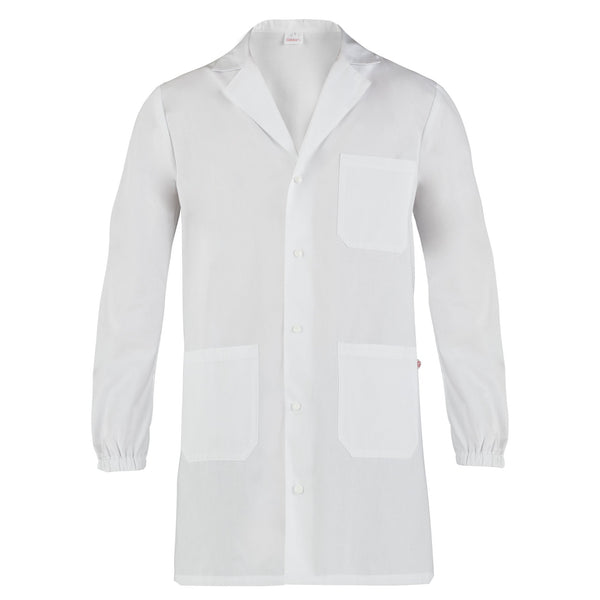 Camice ospedaliero da uomo con un taschino applicato al petto sinistro e due tasche inferiori. Chiusura centrale con automatici. 100% cotone. Polsi elasticizzati. Taglie disponibili: da xs a 4xl. Regualr fit.