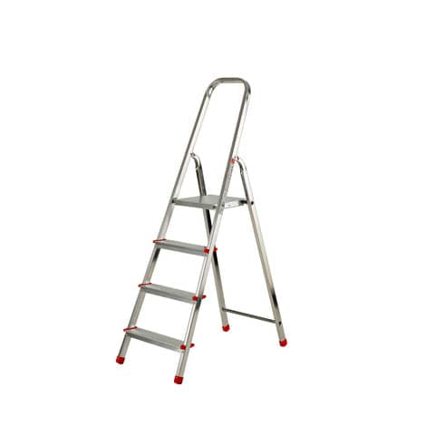 La scala in alluminio Scalamìa è dotata di una struttura in alluminio con rinforzi posteriori per garantire una maggiore sicurezza. La piattaforma è in acciaio con il blocco antiapertura. Due corde antiapertura conferiscono maggiore stabilità, insieme ai piedini antiscivolo zigrinati. Il gradino zigrinato da 81 mm è fissato con un rivetto passante, ed è dotato di una copertura esterna antitaglio. Conforme al D.LGS. 81/08; EN 131, Portata massima 150 kg. Altezza massima di lavoro 2,80 m. Dimensioni prodotto chiuso con imballo H. 1,53 x L. 0,46 x P. 0,14 m. Dimensioni prodotto chiuso senza imballo H. 1,51 x L. 0,44 x P. 0,12 m. Dimensioni prodotto aperto 0,45 x 0,81 x H. 1,41 m. Dimensione massima base scala aperta doppia 0,82 m. Altezza massima del gradino più alto o della piattaforma 0,80 m. Lunghezza del prodotto tutto chiuso 1,51 m. Peso con imballo 4,50 kg. Peso senza imballo 4 kg. Tipo di gradini / pioli gradini. Numero di gradini / pioli 4. Larghezza gradini / sezione dei pioli 8,1 cm. Tipo di base montanti paralleli. Sezione profili / montanti 33x20 mm. Garanzia 5 anni.