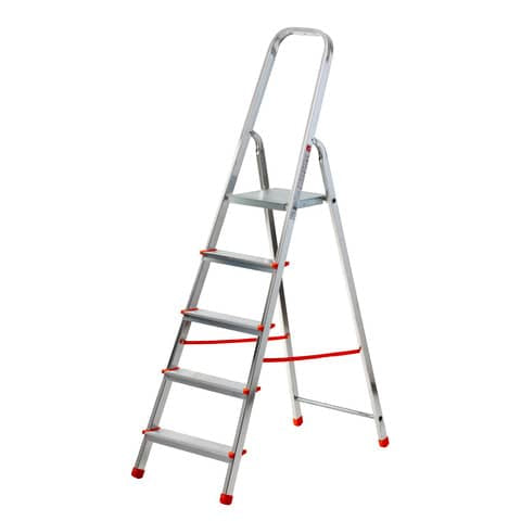 La scala in alluminio Scalamìa è dotata di una struttura in alluminio con rinforzi posteriori per garantire una maggiore sicurezza. La piattaforma è in acciaio con il blocco antiapertura. Due corde antiapertura conferiscono maggiore stabilità, insieme ai piedini antiscivolo zigrinati. Il gradino zigrinato da 81 mm è fissato con un rivetto passante, ed è dotato di una copertura esterna antitaglio. Conforme al D.LGS. 81/08; EN 131. Portata massima 150 kg. Altezza massima di lavoro 3,02 m. Dimensioni prodotto chiuso con imballo H. 1,77 x L. 0,48 x P. 0,14 m. Dimensioni prodotto chiuso senza imballo H. 1,75 x L. 0,46 x P. 0,12 m. Dimensioni prodotto aperto 0,46 x 1,06 x H. 1,63 m. Dimensione massima base scala aperta doppia 1,06 m. Altezza massima del gradino più alto o della piattaforma 1,02 m. Altezza massima prodotto aperto 1,63 m. Lunghezza del prodotto tutto chiuso 1,75 m. Peso con imballo 5,10 kg. Peso senza imballo 4,6 kg. Tipo di gradini / pioli gradini. Numero di gradini / pioli 5. Larghezza gradini / sezione dei pioli 8,1 cm. Tipo di base montanti paralleli. Sezione profili / montanti ant. 40x20 / post.33x20 mm. Garanzia 5 anni.