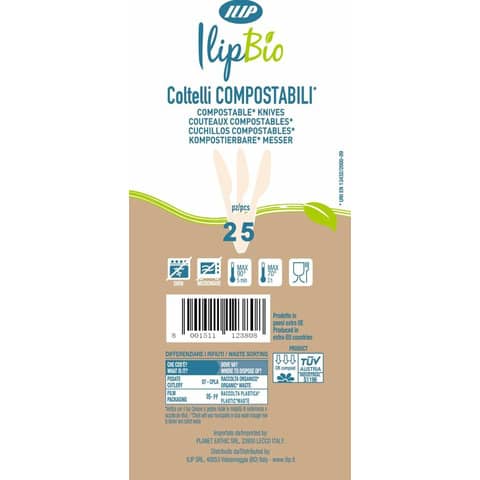 Coltelli in PLA BIO 3,5 g di colore bianco. In confezione da 25 coltelli. Prodotto idoneo a contenere bevande alimentari a base acquosa, acida ed alcolica a temperatura ambiente o inferiore per periodi di tempo prolungati e alla temperatura massima di 70°C per tempi inferiori a 2 h. Non utilizzare in forno o forno a microonde. Normative di riferimento 1935/2004/CE; D.M. 21/03/1973 e successivi aggiornamenti; Regolamento 10/2011/UE e successivi aggiornamenti; Direttiva 94/62/CE e successivi aggiornamenti; UNI EN 13432:2002.