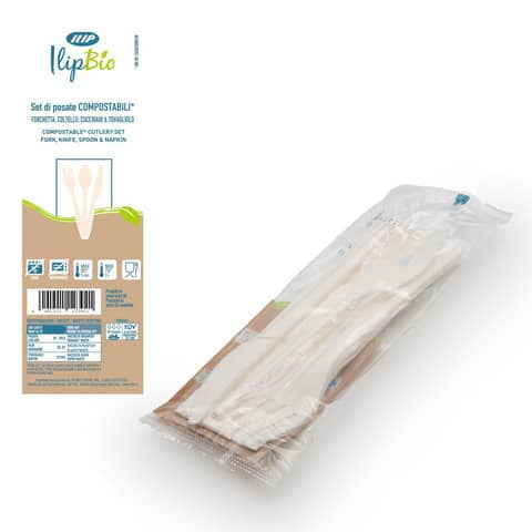 Set di 3 posate coltello + forchetta + cucchiaio con tovagliolo 2 veli. Materiale PLA BIO. Colore bianco. In confezione da 200 set. Prodotto idoneo a contenere bevande alimentari a base acquosa, acida ed alcolica a temperatura ambiente o inferiore per periodi di tempo prolungati e alla temperatura massima di 70°C per tempi inferiori a 2 h. Non utilizzare in forno o forno a microonde. Normative di riferimento 1935/2004/CE; D.M. 21/03/1973 e successivi aggiornamenti; Regolamento 10/2011/UE e successivi aggiornamenti; Direttiva 94/62/CE e successivi aggiornamenti; UNI EN 13432:2002.
