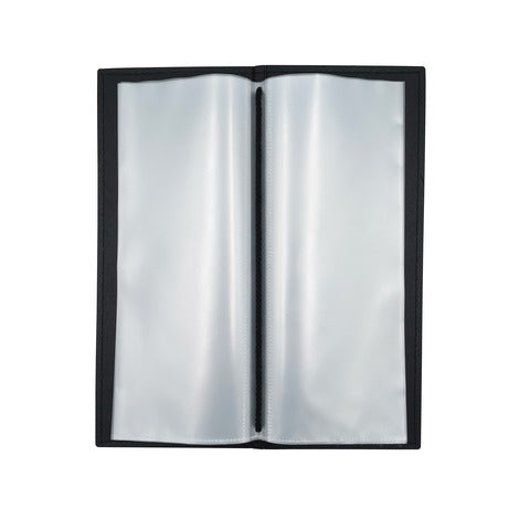Portamenù con 10 tasche e cordino. Dimensioni: ½ A4, 33 x 14 x 0,5 cm. Colore nero. Copertina nera in PP lavabile anche con alcool.
