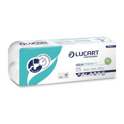 Carta igienica in rotoli della linea Aquastream. Aquastream è la nuova linea di prodotti tissue di Lucart Professional che previene efficacemente gli intasamenti delle tubature dei wc. Una carta di qualità che si dissolve in 7 secondi. Morbida e consistente, è l'ideale per tutti i WC con tubature strette, tortuose o con poca pendenza. Ideale per aerei, treni, navi, campeggi e stabilimenti balneari. In pura cellulosa. Lunghezza rotolo 22 m. 200 strappi per rotolo. Anima standard. Veli incollati con goffratura rose. Certificazione PEFC ed Ecolabel. Prodotto dermatologicamente testato: test di laboratorio hanno dimostrato che il prodotto non è irritante a contatto con la pelle. In confezione da 10 rotoli. Involucro in Poly.