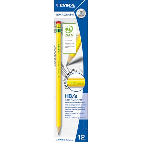 Matita Lyra Temagraph HB Medium. Matita di grafite di alta qualità. Lunghezza 18 cm senza gomma. Mina di grafite finissima extra resistente. Tratti sottili e precisi, facili da rimuovere con una normale gomma per grafite. Corpo a sezione esagonale maggiorata, 7 mm, per agevolare l’impugnatura e non affaticare la mano. Con bottone colorato che identifica la gradazione. Gradazione: HB Medium.