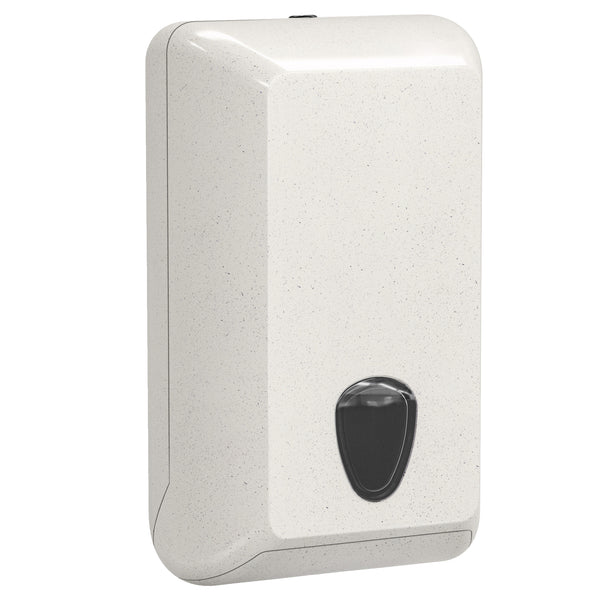Dispenser per carta igienica interfogliata.capacita' 550 fogli se piegati a vcapacita' 450 fogli se piegati a z realizzato in plastica e legno riciclati. Modalita' di fissaggio con viti e tasselli/biadesivo.chiusura: a chiave. Altezza di montaggio: 60-70 cm. Dimensioni: 300 x 132 x 170mm. Made in italy.