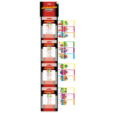 Etichette adesive bianche e colorate. Ideali per la scuola. Perfette per personalizzare matite, penne, quaderni e libri. Disponibili anche nella versione in poliestere adesivo ad alta resistenza. Scrivibili con una normale penna a sfera. Cravatta appendibile composta da 40 buste di etichette personalizzabili. Composizione: 40 buste X10046-2. Dimensioni cravatta: 940 x 145 x 50 mm.
