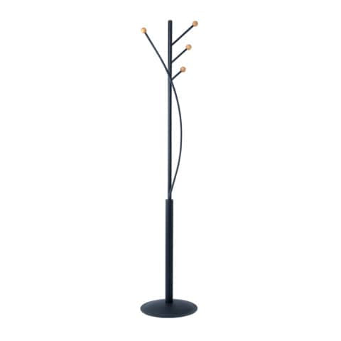 Moderno appendiabiti a stelo in acciaio. La superficie nera opaca crea un interessante contrasto con i pomelli rotondi in legno di faggio. Design dinamico; tre attaccapanni diritti più un attaccapanni arcuato. Poco ingombrante: diametro ridotto, adatto anche per locali piccoli. Sicuro: i pomelli in legno arrotondati non rovinano gli abiti. Particolarmente adatto all'uso privato oppure come secondo appendiabiti. Altezza 180 cm. Base in acciaio Ø 36,5 cm.