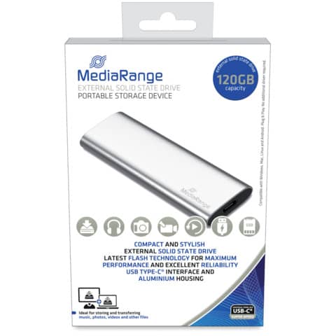Supporto di memorizzazione flash di qualità e affidabilità estremamente buone. Queste unità SSD esterne sono perfette per archiviare e scambiare dati rapidamente. La connessione USB Type-C® e la nuova tecnologia di trasferimento dati USB 3.2 Gen 2 ti consentono di accedere ai tuoi dati in modo ultra veloce, sicuro e conveniente, sempre e ovunque. L'alloggiamento compatto e di alta qualità è facile da trasportare e garantisce che i tuoi dati siano sempre prontamente disponibili. Capacità: 120 GB. Interfaccia: USB Type-C®. Trasferimento dati: USB 3.2 Gen 2. Tecnologia Flash: 3D TLC. Bus interno: SMI 2258XT. Formato: M.2 NVMe. Velocità di lettura: fino a 450 MB/s. Velocità di scrittura: fino a 420 MB/s. Colore: argento. Alloggiamento in alluminio compatto e di alta qualità. Lunga durata d'archivio. Eccellente compatibilità con tutti i sistemi operativi attuali. Cavo di collegamento da USB-A a USB Type-C incluso (circa 35 cm). Adattatore per USB-A a USB-C. Dimensioni 100x29,4x9 mm. Peso netto circa 30 g.