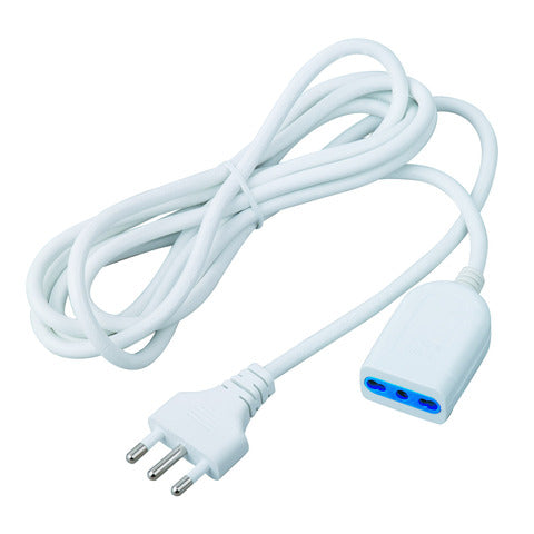 Prolunga lineare di colore bianco. Cavo: 3 x 1 mm², lunghezza 3 m, spina 16A, 2P+T, presa 10/16A bipasso.