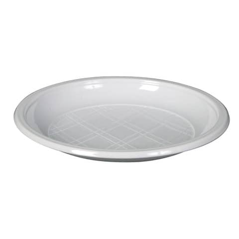 Piatti dessert bianchi in PS-polistirolo. Confezione da 20pz. Peso: 7gr. Idoneo al contatto con gli alimenti. Il prodotto non può essere utilizzato in forno a microonde. Materiali e oggetti ad uso ripetuto idonei a venire a contatto con alimenti a base acquosa, acida e grassa alla temperatura massima di 70°C per meno di 2h o alla massima temperatura di 100°C per meno di 15 min.