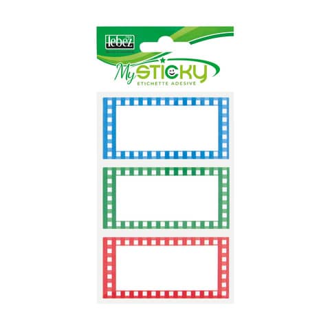 Etichette adesive con cornice colorata, adatte per la scuola. Confezione composta da 18 etichette in tre colori assortiti: verde, rosso e azzurro. Formato 7 x 3,5 cm.
