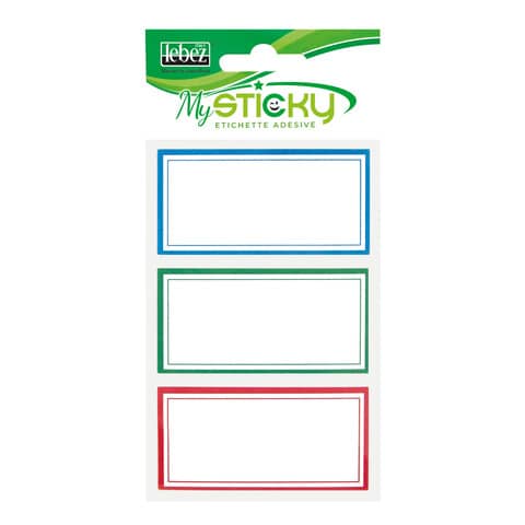 Etichette adesive con bordo, adatte per la scuola. Confezione composta da 18 etichette in tre colori assortiti: verde, rosso e azzurro. Formato 7 x 3,5 cm.