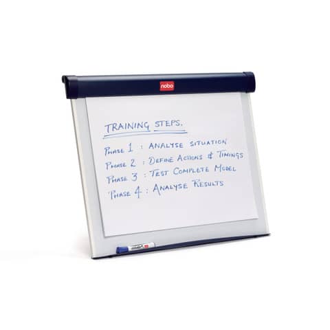 Qualità affidabile dal 1971. Il cavalletto da scrivania Barracuda di dimensioni dimezzate è lavagna a fogli mobili portatile, lavagna cancellabile a secco e bacheca magnetica in uno! Ideale per riunioni tra due persone o presentazioni a piccoli gruppi, può essere aperto in pochi secondi su qualsiasi tavolo o scrivania. Sono inclusi borsa per il trasporto, blocco di fogli B1 e pennarello. Elegante e pratico - Portablocco a cavalletto Barracuda - da scrivania. Colore: blu.