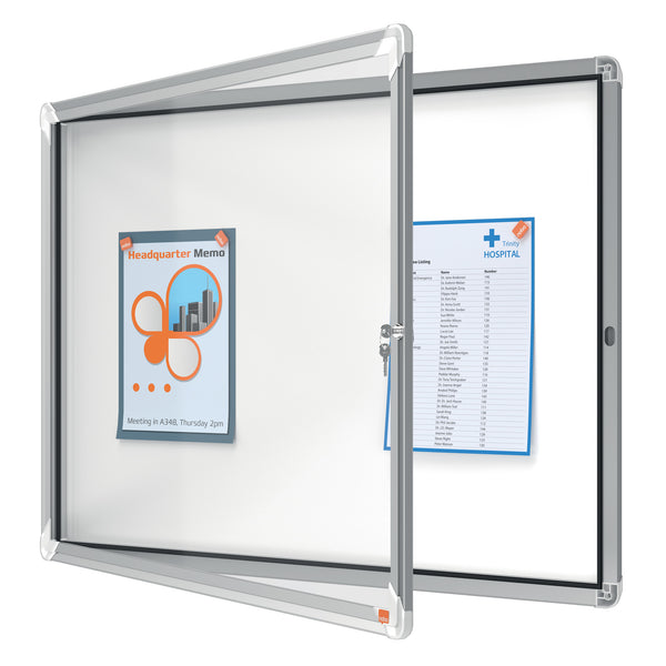 Ad anta battente. Nuovo design con robusta cornice in alluminio e vetro di sicurezza di 4mm. Fondo in acciaio bianco magnetico per uso con magnetini o scrivibile con pennarelli a secco. Fissaggio semplice effettuabile da una sola persona. Serratura con 2 chiavi. Apertura istallabile sia a destra che a sinistra. F.to 8xa4. Dimensione esterna:hl69,2 x l97,2 x p3,7cm