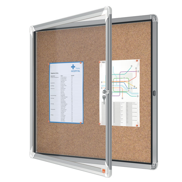 Ad anta battente. Nuovo design con robusta cornice in alluminio e vetro di sicurezza di 4mm. Fondo fondo in sughero per uso con puntine. Fissaggio semplice effettuabile da una sola persona. Serratura con 2 chiavi. Apertura istallabile sia a destra che a sinistra. F.to 6xa4. Dimensioni: 70,8x66,7x4,3cm