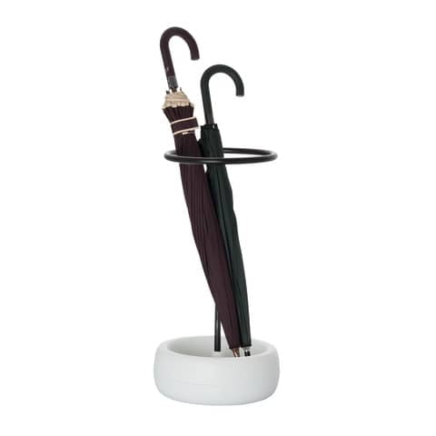 Portaombrelli di design in acciaio con finitura a polveri epossidiche di colore nero.Base in polipropilene bianco di diametro 32 cm. Altezza totale del portaombrelli 60 cm. Può contenere fino a 10 ombrelli. Adatto sia per interni che per esterni. Contenitore raccogligocce facilmente lavabile.