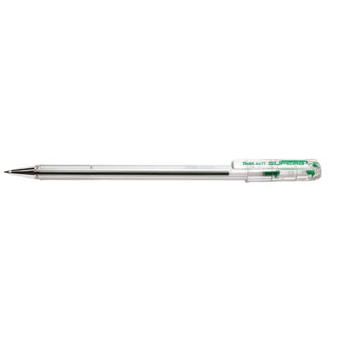 Penna a sfera Pentel Superb BK77 colore verde. Punta fine 0,7 mm. Fusto trasparente per un immediato controllo della riserva dell'inchiostro - lunghezza di scrittura 1200 mt. Confezione da 12 pezzi.