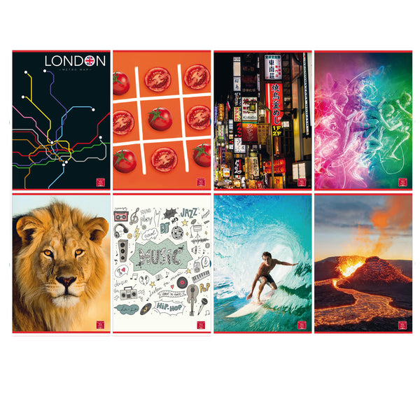 Maxiquaderno rilegato con punto metallico. Copertina in cartoncino da 205gr verniciatura uv. Risguardo personalizzabile stampato fronte e retro. Fantasie assortite.